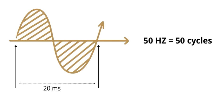 When we say 50 Hz, it means 50 cycles per second. One complete cycle includes one positive half and one negative half. Therefore, one cycle takes 20 milliseconds at 50 Hz. Some countries use 60 Hz instead. Both values are standard.