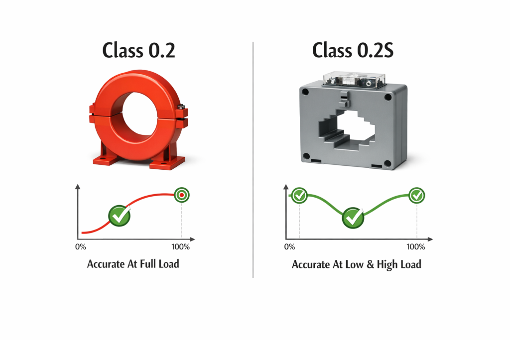 Current transformers are critical in revenue metering. Even small ratio errors can affect billing accuracy. Therefore, selecting the right accuracy class is not just a technical choice. It is a financial decision. In this article, we will clearly explain the difference between 0.2 and 0.2S class based strictly on IEC 61869-2, while keeping the explanation simple and practical.