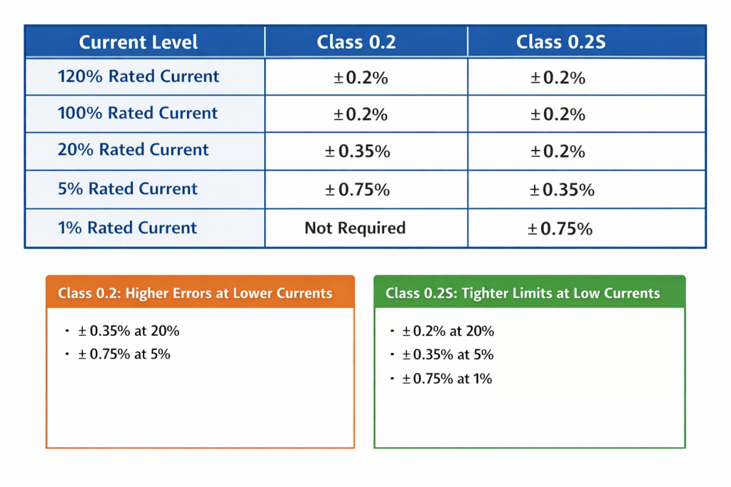 At 200 A, which is 20% load, class 0.2 allows ±0.35% error. Meanwhile, 0.2S allows only ±0.2%. That is a significant improvement.