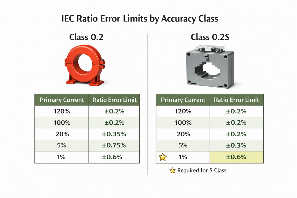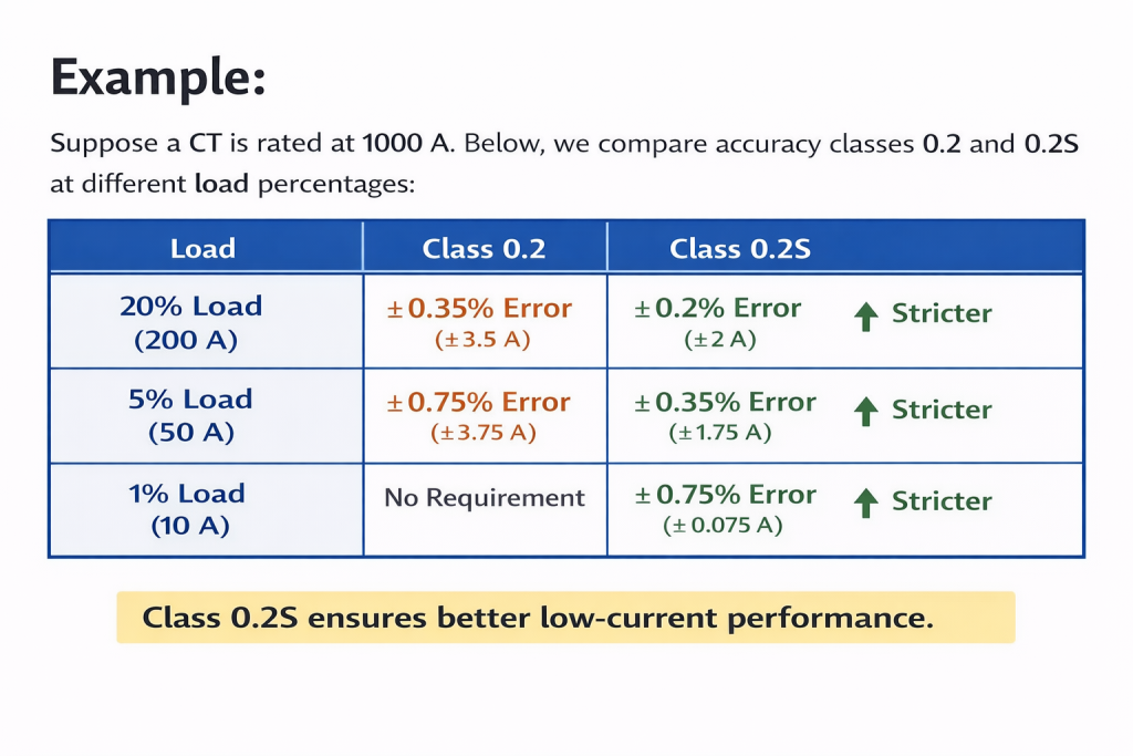 For example, if a CT is class 0.2, it allows ±0.2% ratio error at rated current. If the rated primary current is 1000 A, the ratio error must stay within ±0.2% when 1000 A flows. The same logic applies to 0.2S at 100% current.