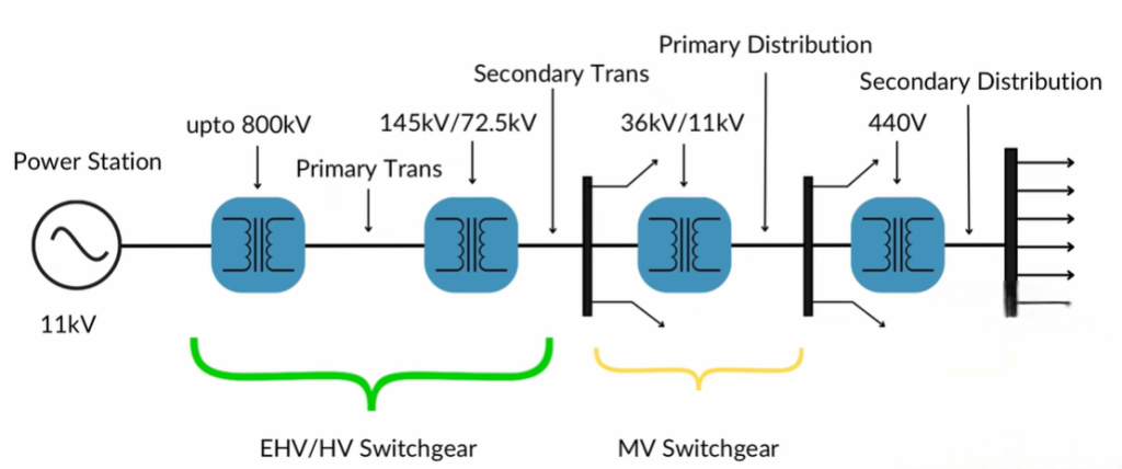 In the primary and secondary transmission stages, we use high voltage switchgear. These voltage levels can go very high. They can reach up to 800 kV. They can also include levels like 72.5 kV or 52 kV.