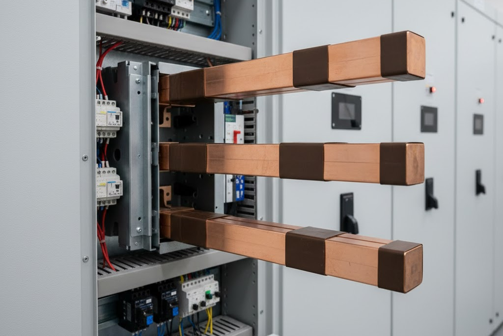 In MV systems, busbars stay inside the panel. They form an integral part of the metal enclosure. Manufacturers mostly use copper here. Aluminium is available but less common. Because the voltage is lower, the insulation needed is also small. So busbars fit easily inside compact compartments.