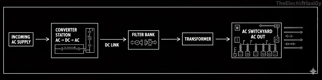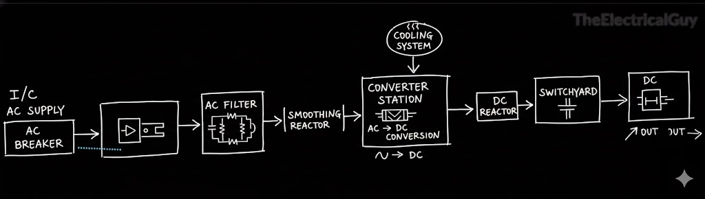 To understand HVDC clearly, it is important to follow the system flow step by step. This explanation starts from the incoming AC supply and moves through each stage, just like the actual transmission process.